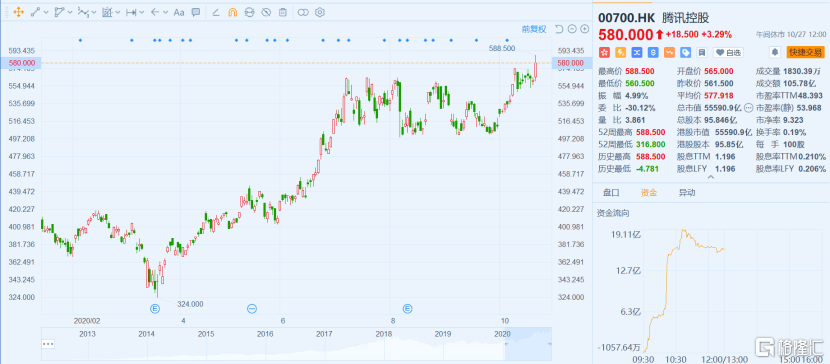 年初至今,腾讯控股已累涨近55%。而自3月最低的322.5港元股价至今的7个月中,腾讯的市值已飙涨超过2万4千亿港元。