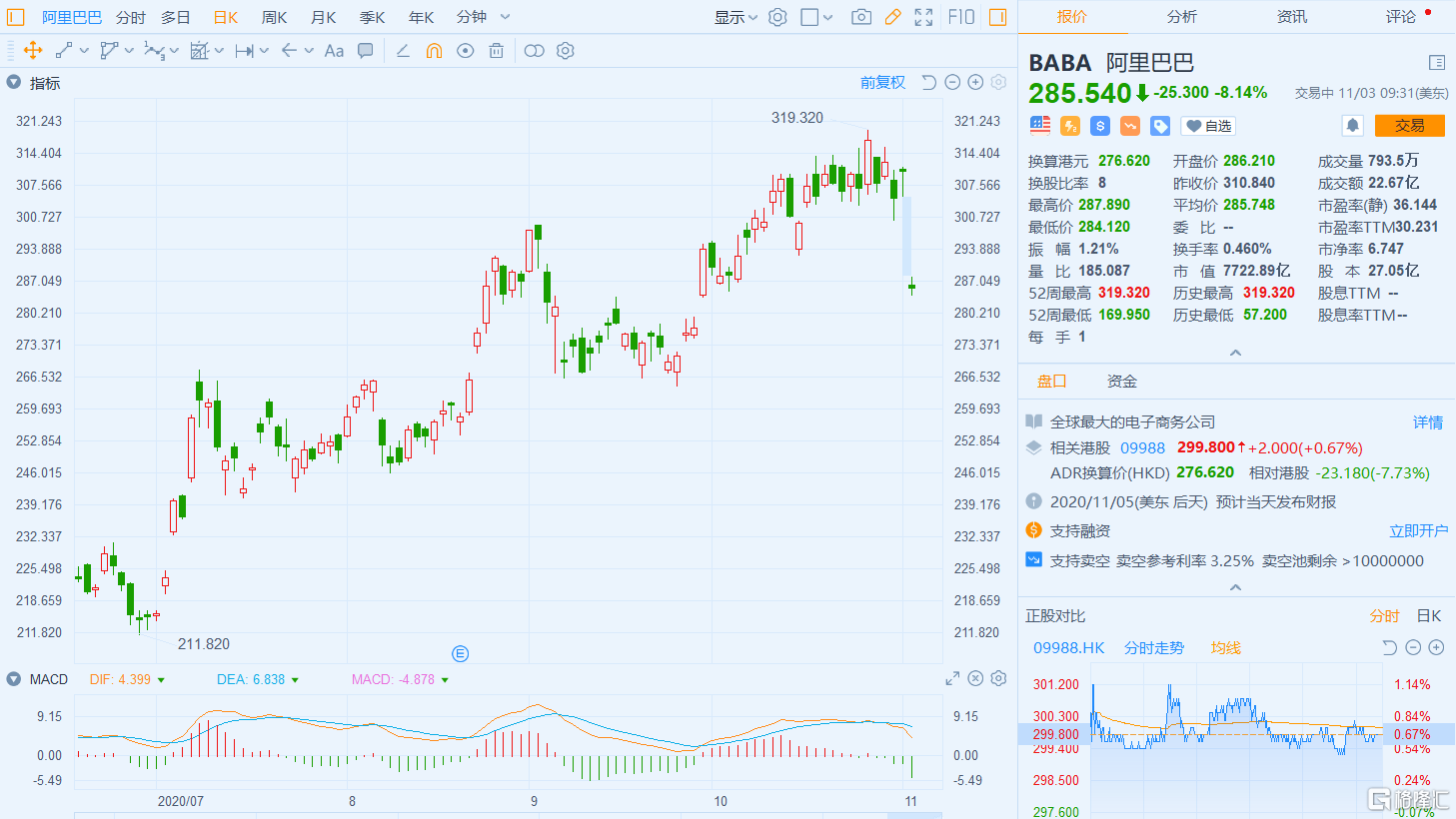 阿里巴巴(BABA)跌超8% 蚂蚁集团暂缓AH股上市计划
