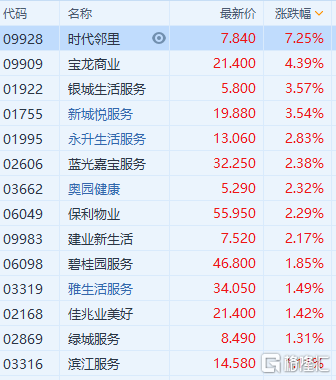 港股异动 | 物管股普涨 时代邻里(9928.HK)涨超7%领涨