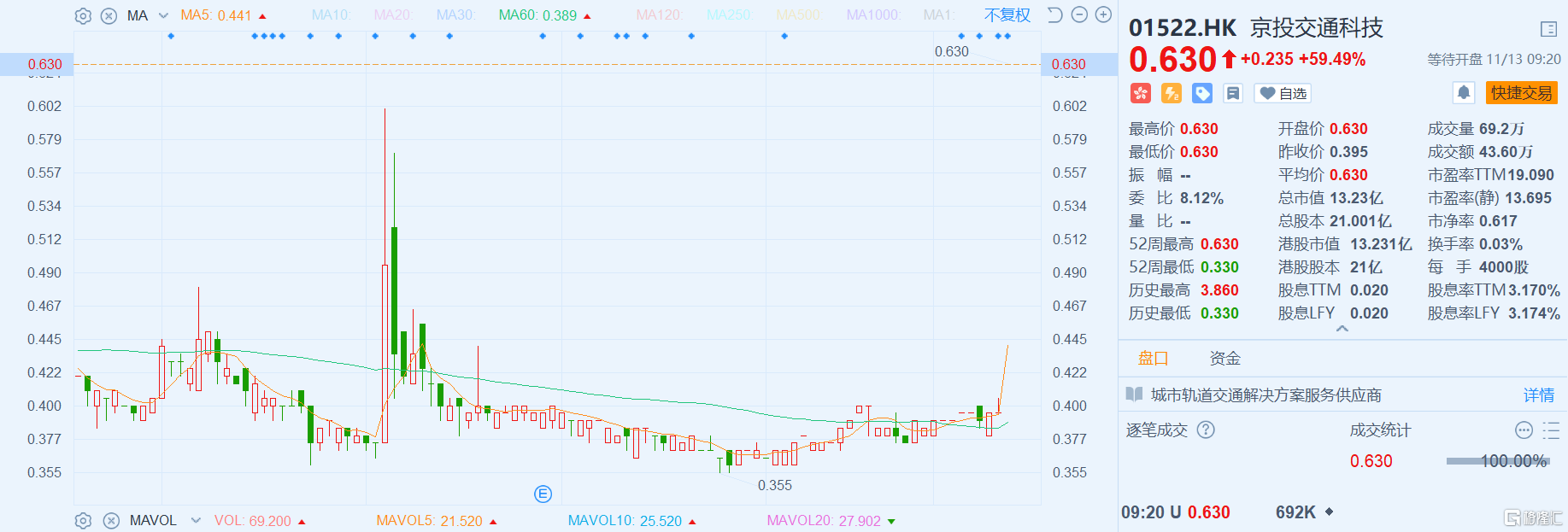 港股异动丨京投交通科技(1522.HK)复牌大幅高开59.49% 控股股东可能提出私有化