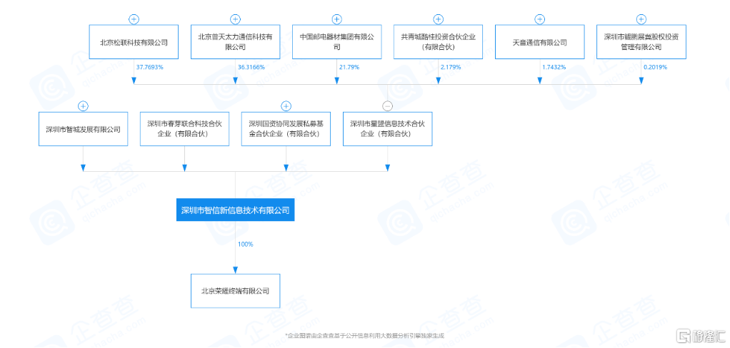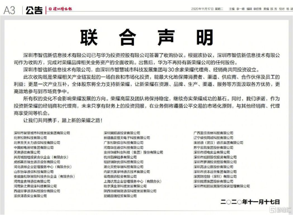 发布联合声明的当日,北京荣耀终端有限公司(下称北京荣耀)核准成立。工商信息显示,北京荣耀由深圳市智信新信息技术有限公司(下称深圳智信)100%控股。