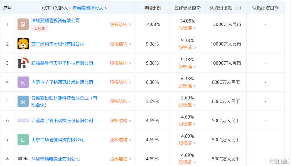 工商资料显示,深圳春芽成于2020年11月10日,股东主要由内蒙古英孚特通讯技术有限公司、深圳冀顺通投资有限公司、新疆鑫晨恒天电子科技有限公司、澳易通(武汉)通讯集团有限公司、苏宁易购集团股份有限公司、深圳市顺电实业有限公司等28家企业组成。其中,深圳冀顺通投资有限公司持股14.08%,为大股东。
