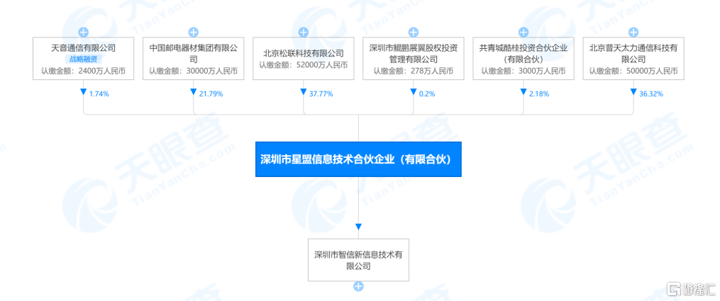 深圳星盟则主要由北京松联科技有限公司、北京普天太力通信科技有限公司、中国邮电器材集团有限公司、共青城酷桂投资合伙企业、天音通信有限公司、鲲鹏展翼6家公司组成。