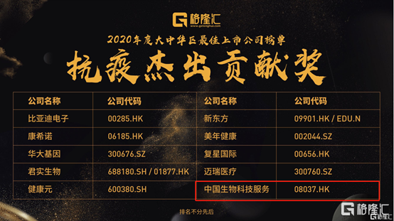 2020年11月16日,由格隆汇主办的“格隆汇·全球投资嘉年华·2020”在四川成都世纪城国际会议中心隆重举行。在“大中华区最佳上市公司颁奖晚会”上发布了2020年上市公司相关奖项,中国生物科技服务(8037.HK)荣获2020年度抗疫杰出贡献奖。