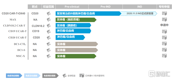 第一大亮点是OX40共刺激信号平台,独立状态的OX40能够更好地模拟天然T细胞激活信号,抗肿瘤活性更强。在研产品CD20 CAR-T-OX40目前已经申报临床并正式获得受理,预计明年初获批,这是国内申报的第一个CD20靶点的CAR-T产品。