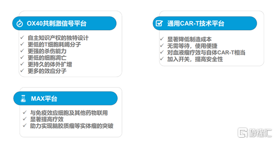 第三大亮点是MAX三款产品,MAX通过其独特的招募因子能克服肿瘤微环境免疫抑制,有望解决实体瘤治疗领域共刺激信号不足、肿瘤浸润困难和肿瘤微环境免疫抑制的世界难题,未来还存在和其他CAR-T疗法、靶向药物等联用的大量可能,有望实现脑胶质瘤等实体瘤的突破。