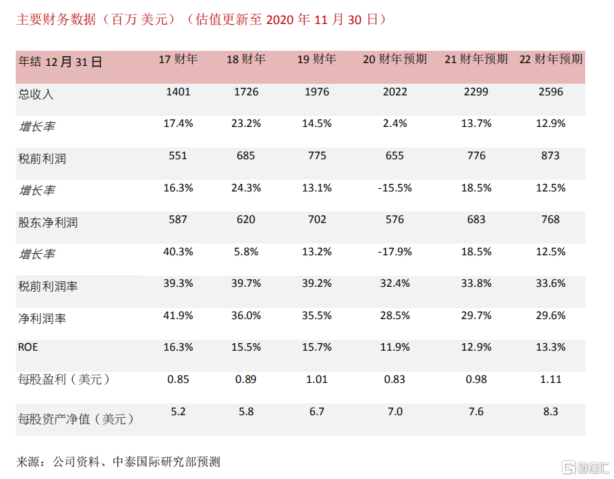 疫苗研发提振市场信心,公司近两周股价已有逾 45%的反弹,但航空公司的经营仍面临不少挑 战,公司面临的租金延付、违约以及承租人破产风险或增加,我们将 2020 年和 2021 年盈利预测分别下调至 5.8 亿美元和 6.8 亿美元。调整公司 2020/2021/2022 年 EPS 预测至0.83/0.98/1.11 美元,预计 2020-22 年 BVPS 分别为 7.0/7.6/8.3 美元,现价对应 PB 估值分别为1.27/1.17/1.07x。我们给予 2021 年目标价 69.75 港元,下调至“中性”评级,对应 1.18 倍 2021年市净率。因疫苗消息而上升逾 45%,已接近我们目标价,现价为 2021 年预测市净率 1.17倍,高于 3 年历史平均水平。