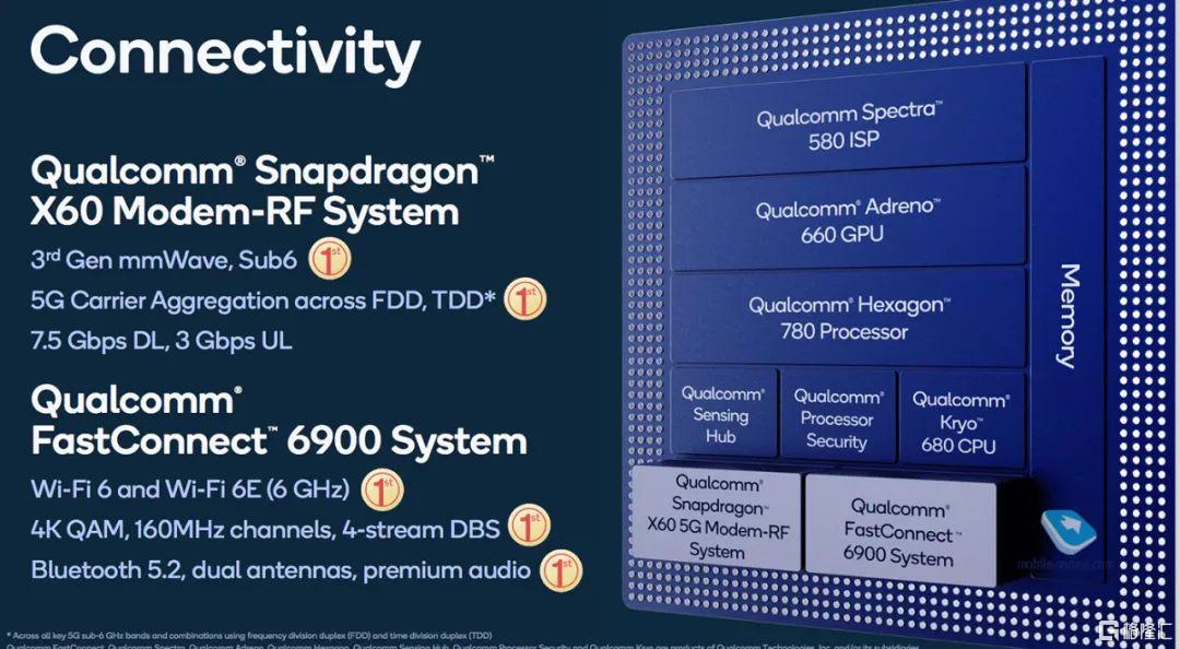 在主芯片里,高通集成了全新的X60 5G基带,不像上一代骁龙865那样,用外挂5G基带的方式实现5G连接。这可能是骁龙888的最大亮点。