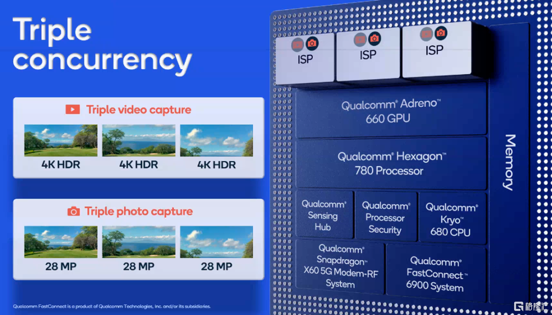 更重要的是,3个ISP可以同时使用和处理图像。举例来说,旗舰手机常见的超广角、广角和长焦镜头通过骁龙888可以被同时调用,同时拍摄3个4K HDR视频,或者拍摄3张2800万像素大小的超高像素照片。