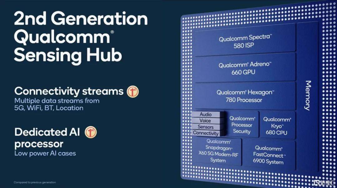 这一改动让骁龙888的算力相比上代提升了73%。而人工智能引擎还整合了高通的第二代传感器中枢,增加了一颗专用的低功耗AI处理器,将传感器中枢的AI性能提升5倍。