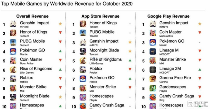 Sensor Tower数据显示,10月,全球手机游戏收入排行榜前三名依次为《原神》、《王者荣耀》、《PUBG手游》,其中,《原神》10月的全球预估收入为2.39亿美元;9月,《万国觉醒》月收入亦超过1亿美元。