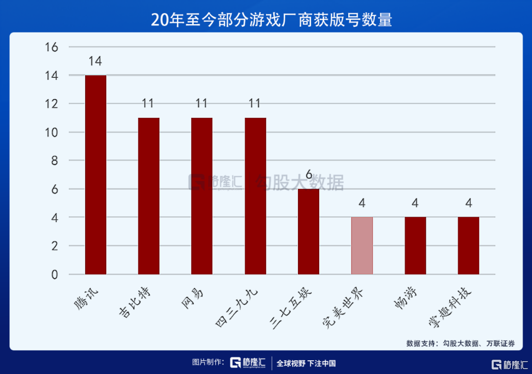 从发行数量上来说,完美世界跟国内游戏行业龙头还有不小的差距,腾讯今年获得14张版号,吉比特,网易,四三九九均获得11张版号,而完美世界仅获得4张版号,也就是说今年发行游戏的上限为4款,处在第三梯队。
