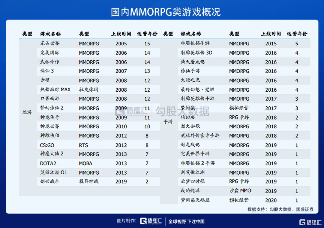 《新神魔大陆》是一款MMORPG(大型多人在线角色扮演游戏)手游。完美世界能够做出这样的爆款,源于公司对MMORPG这个游戏细分领域的长期耕耘,在完美世界所有发行的游戏中,MMORPG类占比达到74%。在国内整个MMORPG类游戏中,完美世界的市占率达到了22.5%。如下图所示,完美世界研发和代理的游戏几乎均为MMORPG。