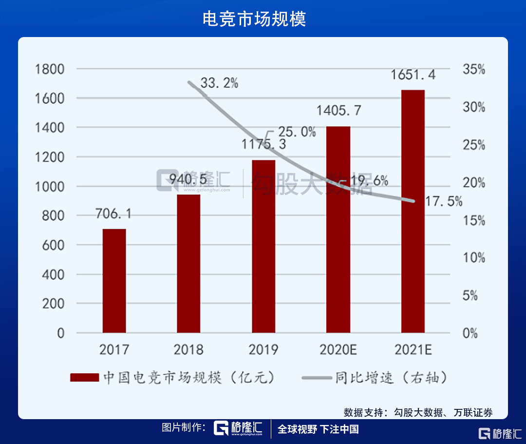 完美世界在电竞赛道也有充分的布局,主要依托于两款国际级竞技类游戏,《DOTA2》和《CS:GO》。在整个游戏板块增速乏力的背景下,电竞市场增长相对保持较高增速,未来两年预计能维持18%左右。