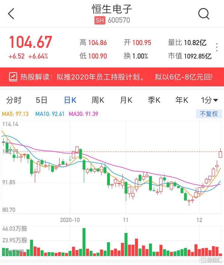 格隆汇12月9日丨恒生电子(600570.SH)今日续涨,暂9日连升累涨超22%,现报104.67元,涨6.64%,暂成交10亿元,最新总市值1092亿元。恒生电子昨晚公布,公司拟以6亿元-8亿元回购公司股份,回购价不超人民币120元/股(含),回购期限自公司董事会审议通过回购股份方案之日起12个月内。此次回购的股份将用于员工持股计划。同日公司亦发布2020年员工持股计划(草案),此次员工持股计划募集资金总额上限为4.532亿元。参加员工应缴纳的资金总额为员工认购的股数上限1000万股,按照每股45.32元/股计算得出。
