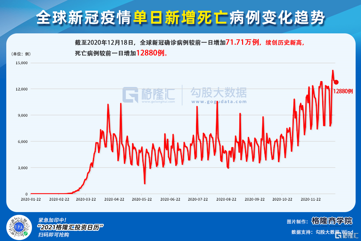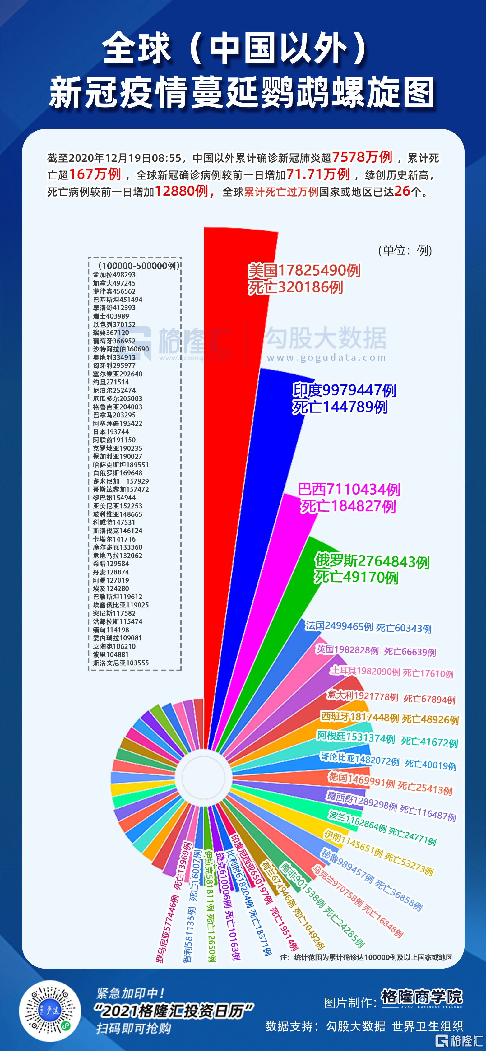 截至2020年12月19日08:55,中国以外累计确诊新冠肺炎超7578万例 ,累计死亡超167万例 ,全球新冠确诊病例较前一日增加71.71万例 ,死亡病例较前一日增加12880例,全球累计死亡过万例国家或地区已达26个。