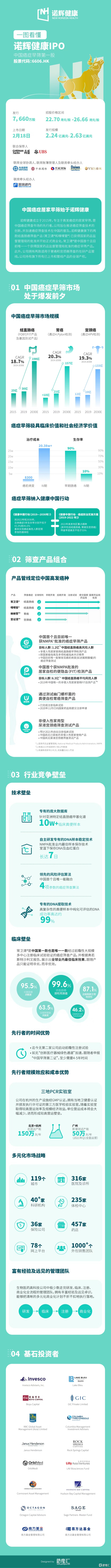 中国癌症早筛第一股诺辉健康(06606.HK)2021年2月5日-2月10日招股,预计2月18日上市。公司拟全球发售7659.8万股,其中香港发售766万股占10%,国际发售6893.8万股占90%,另有15%超额配股权;发行区间为22.70港元-26.66港元,每手买卖单位500股,入场费约13464.33港元;高盛和瑞银为联合保荐人。