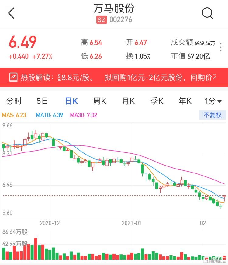 格隆汇2月9日丨万马股份(002276.SZ)现报6.49元,涨7.27%,暂成交6949万元,最新总市值67亿元。万马股份昨日晚间披露回购部分社会公众股份方案称,此次回购股份资金总额不超过2亿元(含),且不低于1亿元(含);此次回购股份价格不超过人民币8.80元/股(含);回购期限自董事会审议通过回购方案之日起不超过6个月。