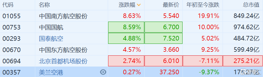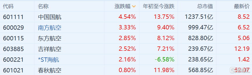 格隆汇2月23日丨疫情向好及经济复苏预期下,低估值航空股受到资金关注,今日盘中港A两市航空股集体拉升。A股市场中国国航涨近5%领涨,南方航空涨超3%,东方航空、吉祥航空和ST海航涨超2%;港股市场,中国国航和南方航空涨超8%领涨,国泰航空和东方航空涨超4%。