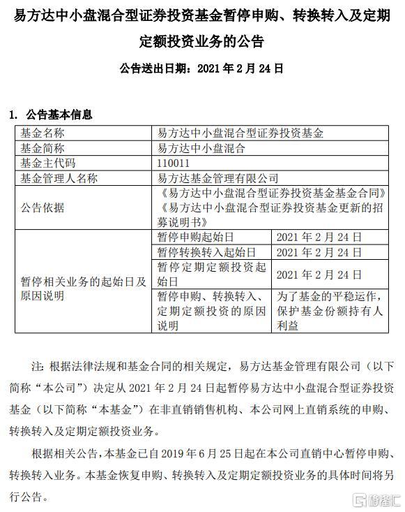 2月23日晚间,易方达基金发布公告称,2月24日起暂停易方达中小盘在非直销销售机构、公司网上直销系统的申购、转换转入及定期定额投资业务。