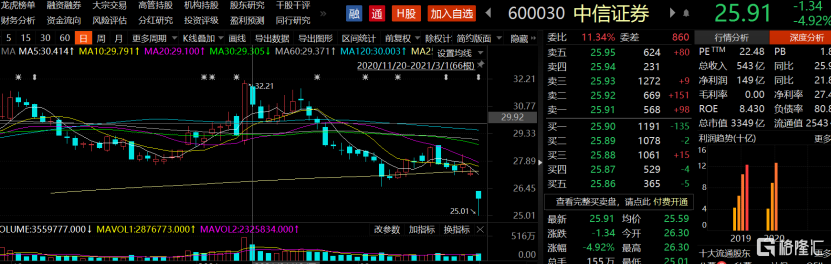 1月22日,中信证券曾发布了2020年的业绩快报。初步核算,公司2020年营业收入543.48亿元,同比增长25.98%,归母净利润为148.97亿元,同比增长21.82%。业绩略低于预期的同比增长26%。