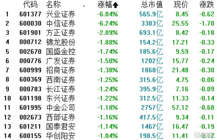 证券板块也普遍飘绿,超30家券商下跌。兴业证券大跌近7%,广发证券、招商证券、中金公司等跟跌。