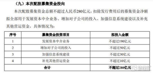 2月26日晚,中信证券发布公告称,公司拟按照每10股配售不超过1.5股的比例向全体股东配售,配股募集资金总额不超过人民币280亿元,扣除发行费用后的募集资金净额拟主要用于发展资本中介业务。