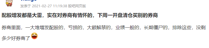 有投资者表示,配股增发都是大雷,最近配股增发的数量过多,持仓风险过大;对于近日大盘的波动,也有投资者担心中信的大跌会打崩大盘。总体来说,利空的声音占大多数。