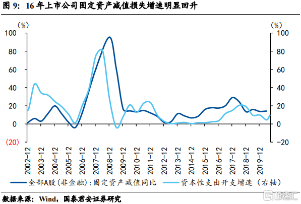 2) 然后,从上市公司角度来看,设备更新有加速的趋势。如果我们观察上市公司固定资产减值准备,会发现两个的特点,其一是与资本开支增速的趋势基本一致,其二是16年固定资产减值准备增速出现明显的抬升。其含义可能是企业存在设备更新的需求,普遍计提减值,同时更新设备,表现为资本开支增加。16年前后正是设备更新潮的关键节点,因此减值计提和资本开支均上升,但更新潮被去杠杆和中美贸易摩擦打断。不过更新需求仍然存在,减值计提近几年仍然保持较高水平。