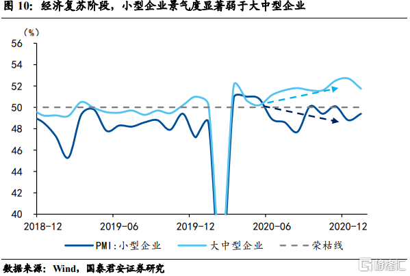 疫情出清中小企业,传统行业龙头扩产能抢占市场份额。20年疫情造成的经济停摆,对各类型企业现金流、经营活动均造成了巨大的影响,而复产复工推进以来,小企业修复进度明显慢于大中型企业,20年5月份以来,大中型企业PMI持续上行,而小型企业则持续收缩,经济复苏表现为“K型”复苏态势。因此,一面是疫情出清小企业产能,另一面是大企业持续高景气、产能吃紧。而随着国内需求端的持续修复,传统行业龙头存在扩产能以抢占市场份额的空间和动力,传统行业龙头企业资本开支增加将成为本轮朱格拉周期的重要支撑。