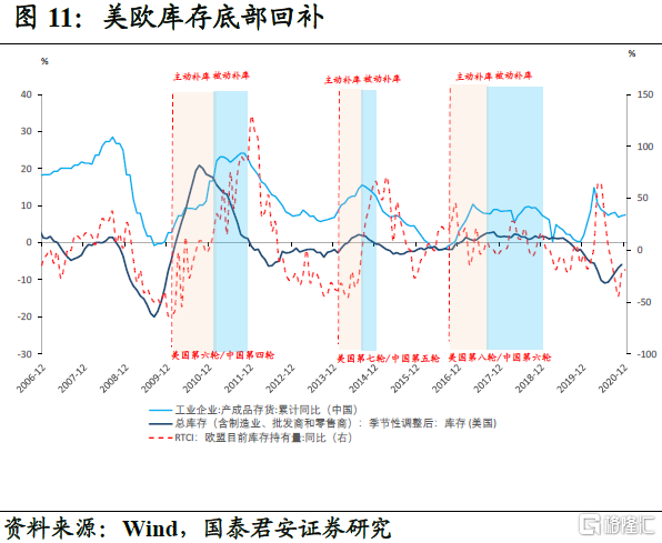 海外库存底部回补,全球朱格拉周期共振上行。在美欧消费需求强、产能修复弱的背景下,海外库存大幅下降,当前美、欧库存已至底部(分别为自2010年以来的6%、8%分位)。而随着经济复苏的推进,供需差将拉动海外补库周期。从历史经验来看,美国批发、零售环节加库将持续至明年5-6月份,制造业加库将持续至2022年。除此之外,美国在财政刺激落地后,依然有基建计划的空间,其中对于传统基建、绿色基建、制造业升级均有较大的投资空间,因此在全球流动性依然宽松背景下,外部支撑延续性较好。