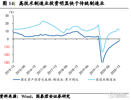 新能源、新基建等新经济领域高歌猛进,高技术设备投资将持续受益。我国已经提出了二氧化碳排放力争2030年前达到峰值,力争2060年前实现碳中和的目标,根据清华大学气候变化与可持续发展研究院测算,2020年我国非化石能源占比仅16%,到2030年将提升至25%,2050年将提升至70%以上。新能源对传统能源的替代过程将持续发生,新能源领域设备无疑将成为新一轮设备投资的重点。除此之外,20年初提出的5G、特高压等新基建也将持续推进。从数据上看,高技术制造业投资20年全年仍保持11.5%的增速,远高于制造业整体的-2.2%。新经济的持续发力也将成为本轮朱格拉周期的核心推力之一。