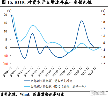反映企业扩产的意愿指标——ROIC。ROIC是企业投入资本回报率,表征盈利水平。相比于ROE,可以排除财务杠杆等因素的扰动,更直观的反映企业的经营效率。在全行业层面,ROIC对上市公司资本开支存在一定的领先性。
