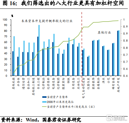 进一步的细分赛道筛选上,我们从微观数据出发:由于企业的持续资本开支既要有意愿,又要有能力。我们最终确定为,当前ROIC增速较快,且处于历史中低分位,企业资产负债率较低,未来具有加杠杆空间的赛道。这些兼具能力和意愿的细分行业有: