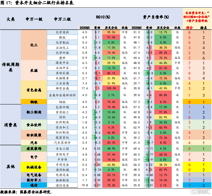 我们在之前总结出的资本开支有望抬升的周期、消费两大类行业中进一步筛选,最终得到了申万二级的行业排名表。