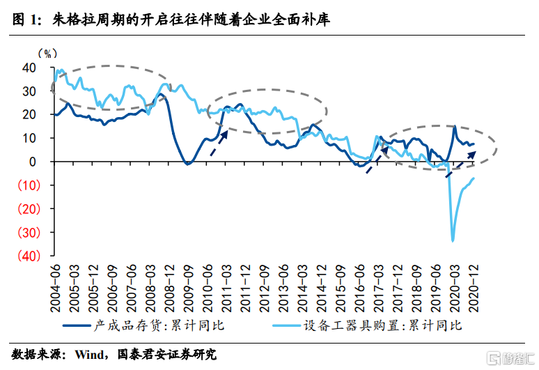 全面补库往往是朱格拉周期开启的伴奏。回顾历史经验我们会发现,库存周期和朱格拉周期存在一定的关联,朱格拉周期的加速通常伴随着企业的全面补库。比如 10-11 年第二轮朱格拉周期前期,库存周期全面启动,固定资产投资中设备工器具投资持续处于 20%以上的高增长状态。再比如 16 年底企业再度补库,设备工器具投资亦从 16 年 9 月不足 2%快速攀升至 17 年初超过 10%。