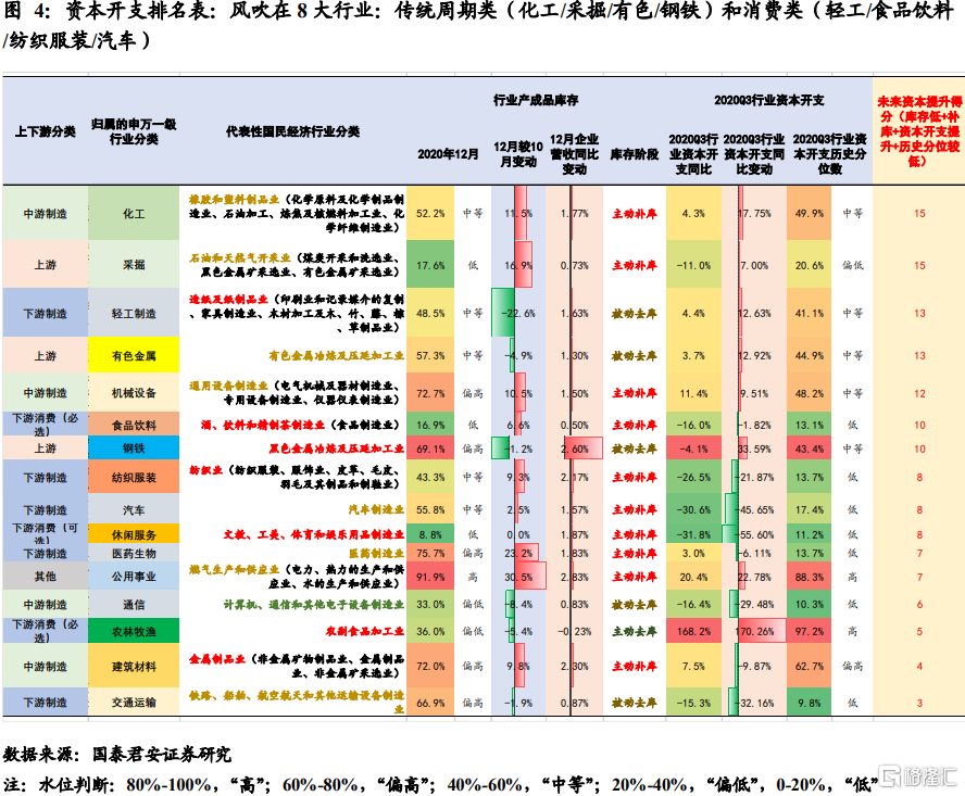 3) 基于资本开支同比及历史分位,企业库存同比及历史分位的2×2分析框架,我们量化排名梳理了未来资本开支提升最强劲的八大行业:传统周期类中的化工、采掘、有色、钢铁以及消费类的轻工、食品饮料、纺织服装、汽车。
