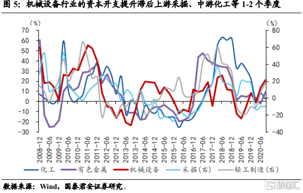 4) 8大行业资本开支拉动机械设备行业盈利。从历史周期看,过去机械设备类行业的资本开支提升滞后上游采掘、有色、中游化工等1-2个季度。