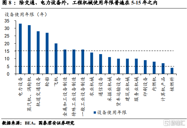 1)  首先,设备使用存在一定的年限,上一轮更新的设备基本到了更新换代期。根据BEA测算,除了电力、交通设施外,其他机械设备使用年限大部分在5-15年之间。我国第二轮朱格拉周期开启于09年,距今已经10多年,有相当规模上一轮扩产或更新的设备使用时间已经超过10年,因此存在大量设备更新换代的潜在需求。