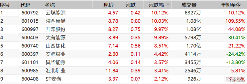 煤炭概念涨幅居前,陕西黑猫、云煤能源、开滦股份等封板;大有能源、山西焦化涨逾8%;安源煤业、昊华能源、淮北矿业涨超3%。
