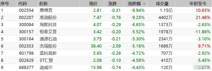 能源设备板块大跌,惠博普跌停,准油股份大跌9%;海默科技、恒泰艾普、通源石油、杰瑞股份跌逾5%。