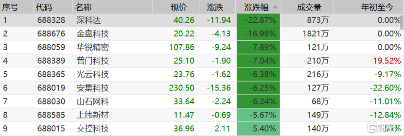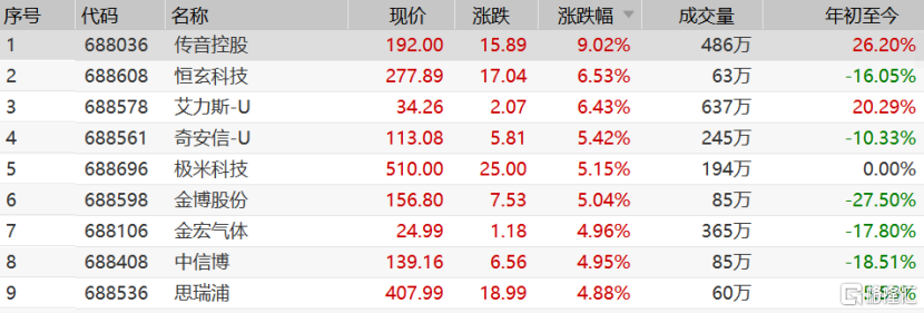 科创板方面,传音控股、恒玄科技、艾力斯-U涨逾7%,极米科技、奇安信-U等跟涨;而深科达、金盘科技领跌,跌超16%,华锐精密、普门科技、光云科技等均跌逾6%。