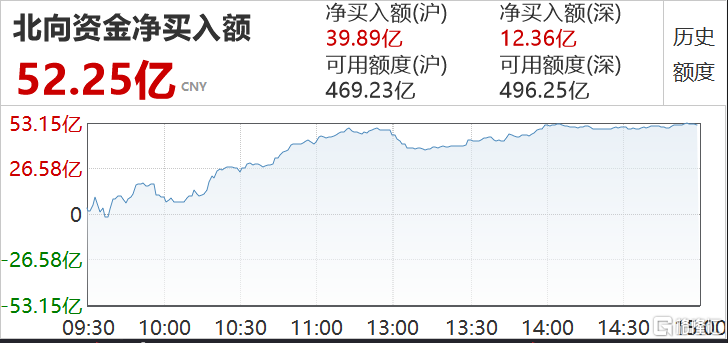 北向资金今日合计净买入52.25亿元,其中沪股通净流入39.89亿元,深股通净流入12.36亿元。