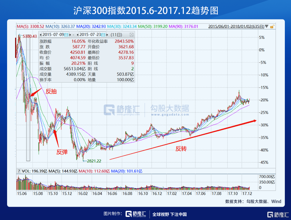 用2015年的沪深300来看,泡沫破灭后,反抽、反弹、反转的阶段很明显(注:创业板的反转时间是2018年10月才到来)。