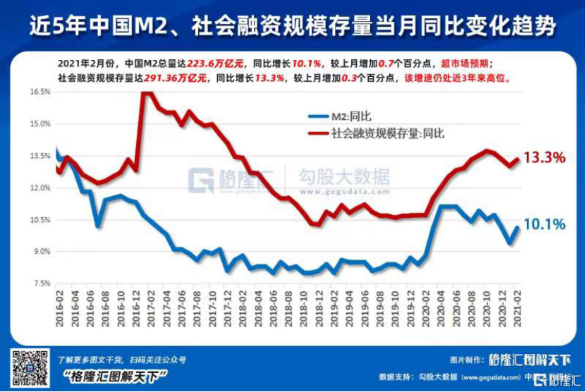 货币数据会这么好,主要原因是社融不错,因而派生存款多,2月的社会融资新增达1.71万亿,为历年新高。在新增不错的推动下,社融存量规模的增速也结束了连续3个月的下滑。