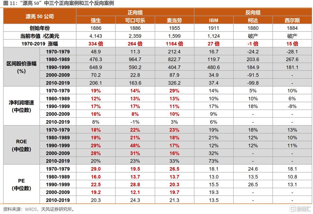 从事后观察角度,我们挑选“漂亮50”中三个正向案例和三个反向案例来做比较。三个正向案例:麦当劳、强生、可口可乐。三个反向案例:IBM、柯达、西尔斯。