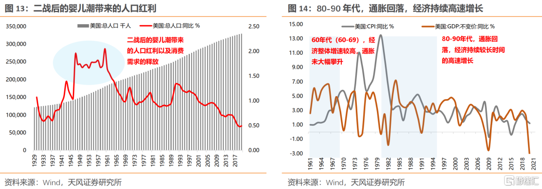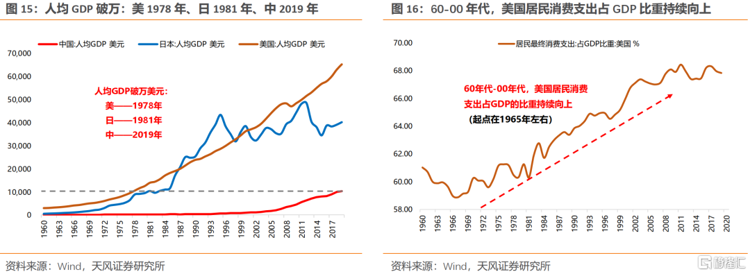 (1)二战后婴儿潮带来的人口红利以及消费需求的释放,加上减税、财政刺激等政策举措,开启了60年代之后的消费“黄金时代”(居民消费占GDP比重由1965年持续提升至2010年左右);