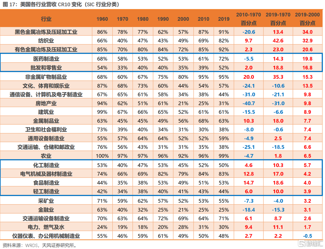 (2)第二级跨越:80S-90S行业集中度的提升。随着经济从高速增长阶段进入低速稳步增长阶段,多数行业都会出现集中度提升的过程。不仅包括上游的资源、原材料行业,还包括中游的制造业,下游的零售、医药等,在80年代之后,行业集中度都有显著提升。