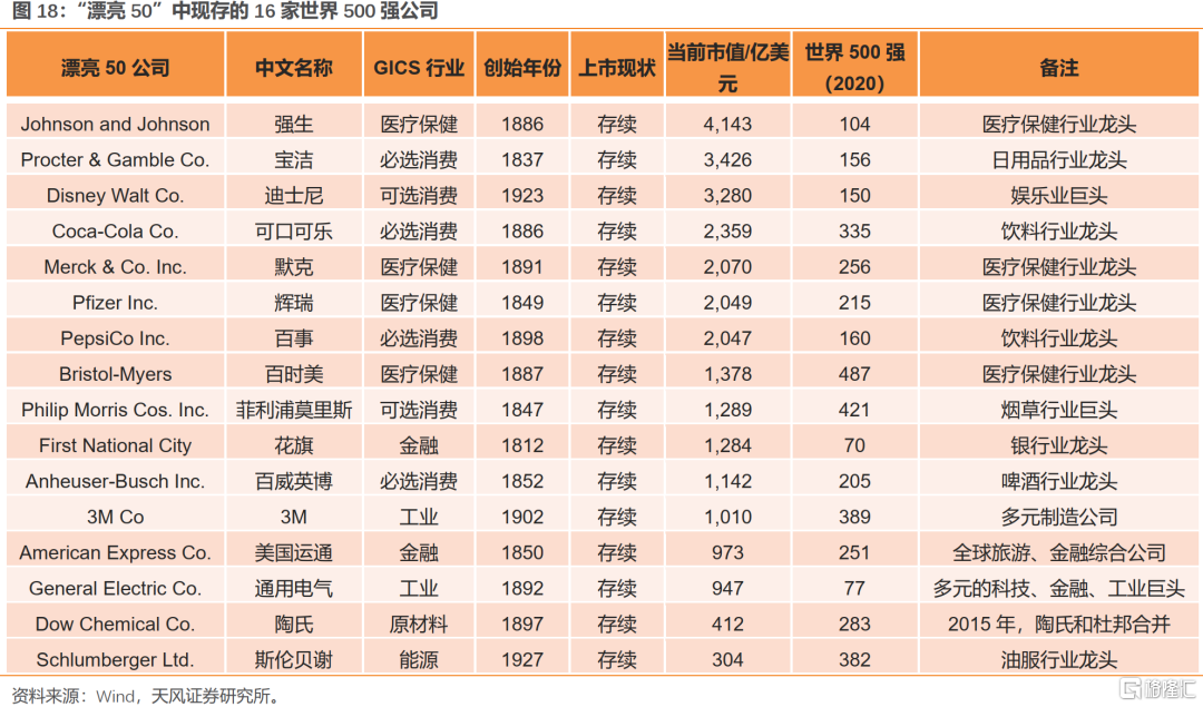 1、“漂亮50”分布:大消费有31家,工业6家,金融3家,能源3家,原材料2家。目前仍有42家存续(27家存续,15家重组后存续)。在27家上市主体存续的公司中,截止2020年底,平均市值接近1300亿美元,且有16家位列世界500强。