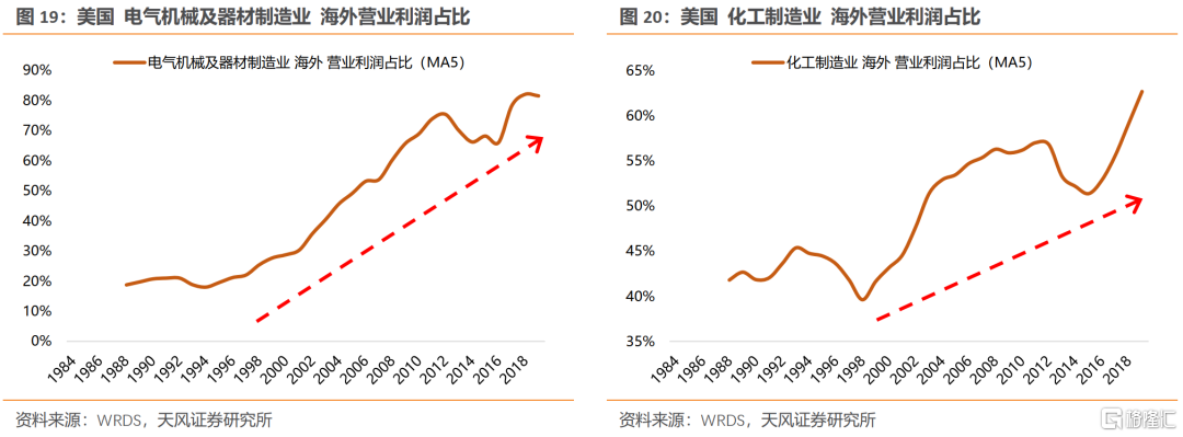 90年代以来,全球化扩张的步伐,是支撑美股各行业龙头盈利和股价再上台阶的关键。全球化扩张不只带来这些行业龙头公司新的成长空间,而且也驱使行业周期性弱化,甚至能获得盈利能力中枢的抬升。